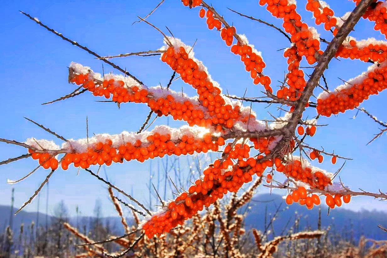 沙棘,山西人叫它“醋柳柳”“酸溜溜”。这种令人闻之满口生津的果子,个头虽小,却富含氨基酸、维生素、多酚、黄酮等多种营养物质,果子能榨汁、果皮能入药、果籽能榨油,可谓浑身都是宝。
