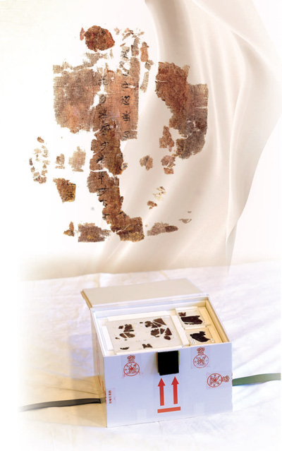 下图:5月18日,装有子弹库帛书的文物包装箱在北京首都国际机场开启。本报记者 朱笑熺摄