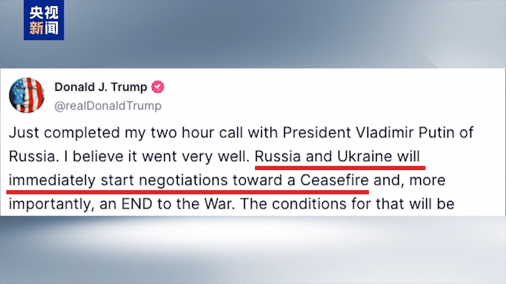 打完三通电话后, 特朗普称,俄罗斯和乌克兰将立即启动谈判,以实现停火。
