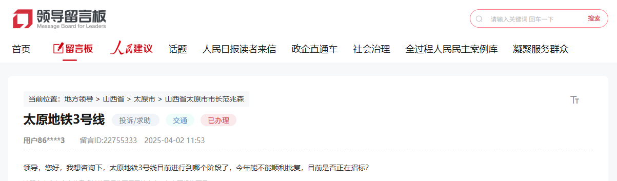 5月21日,记者从人民网领导留言板获悉,太原市人民政府对太原地铁3号线的项目进展给出答复: