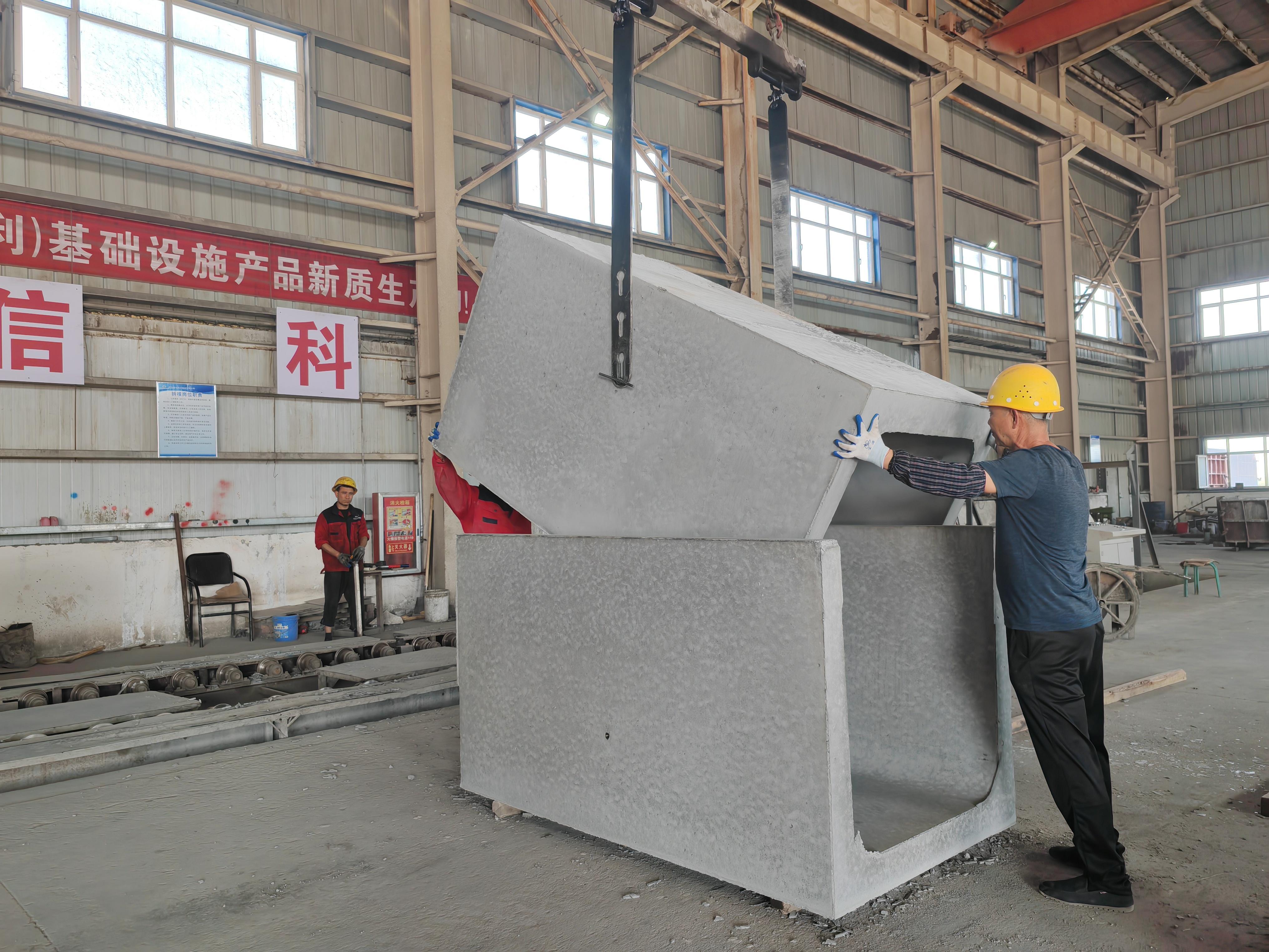 在经过高效养护后,生产进入拆模吊装环节。通过预制在矩形渠两侧的吊孔,安装在车间顶部的航车可轻松地对产品进行安全移动吊装。