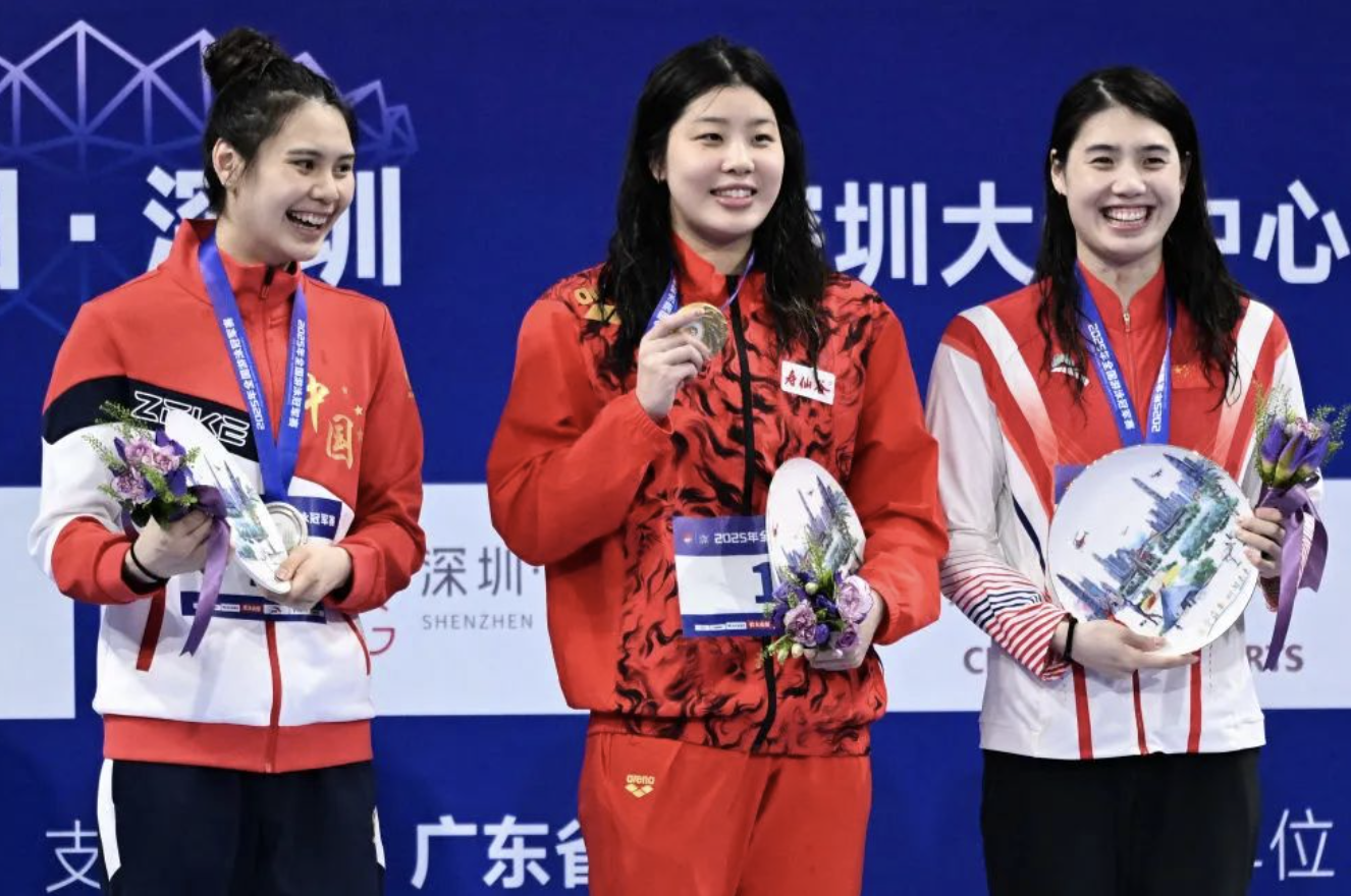 5月23日,冠军吴卿风(中)、亚军王一淳(左)和季军张雨霏在颁奖仪式上。新华社记者 夏一方 摄