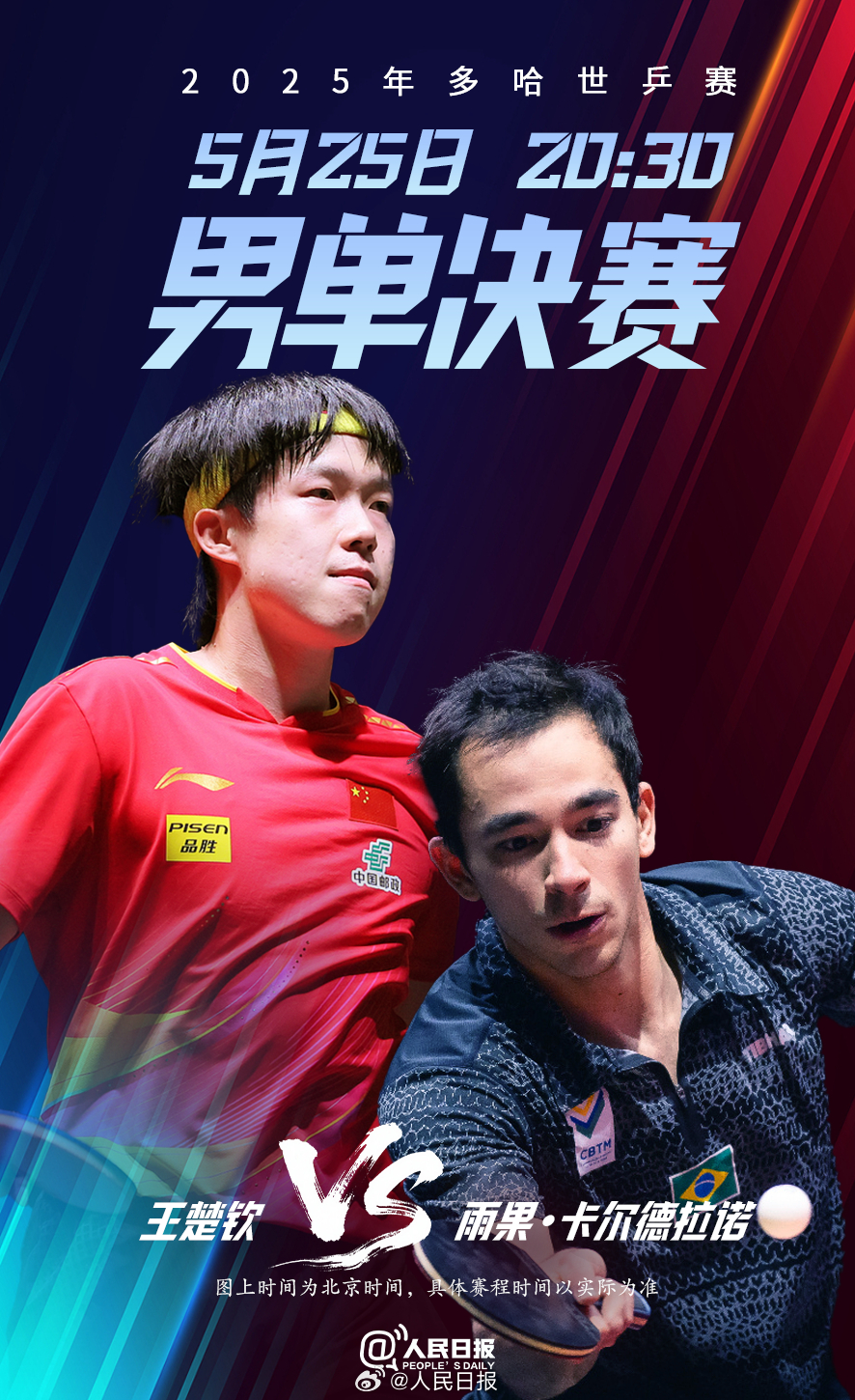 2025年多哈世乒赛男单决赛将于5月25日20:30举行,中国选手王楚钦对阵巴西选手雨果·卡尔德拉诺。巅峰对决,一起期待,为中国队加油!