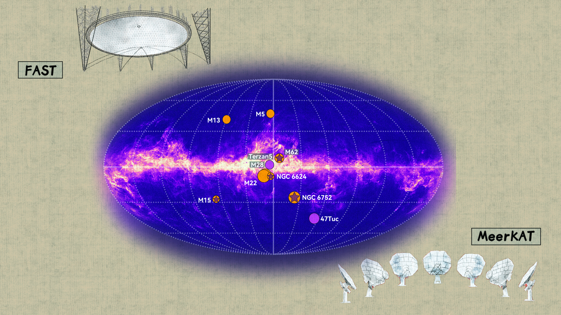 FAST和MeerKAT望远镜首次系统性开展的球状星团脉冲星偏振研究。天空背景为银河系尘埃,标示了8个本次重点研究的球状星团(黄圈)和2个已有先前研究的球状星团 (紫圈)。