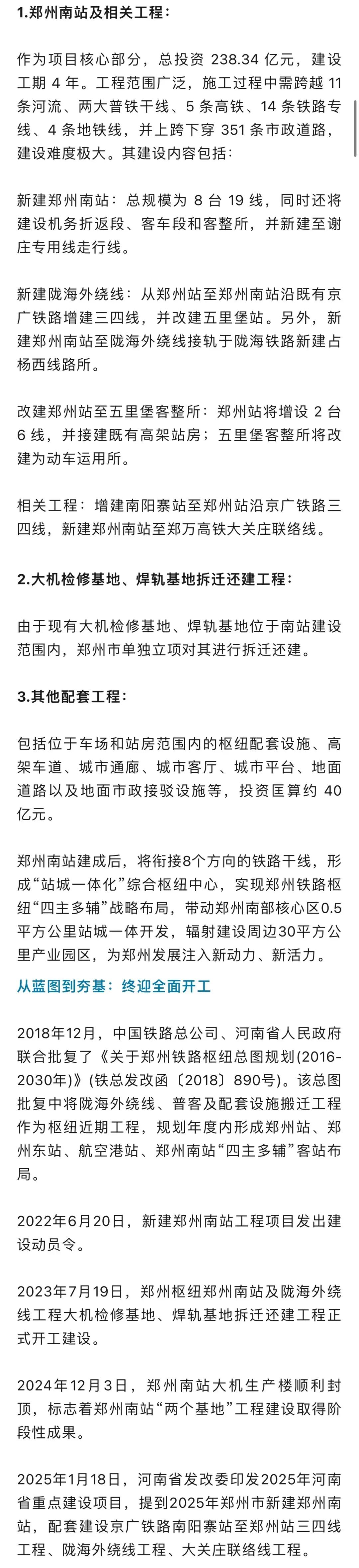 2025年4月27日,河南省政府明确将郑州南站列为2025年重点建设项目,配套工程纳入年度计划(豫政办〔2025〕21号)。