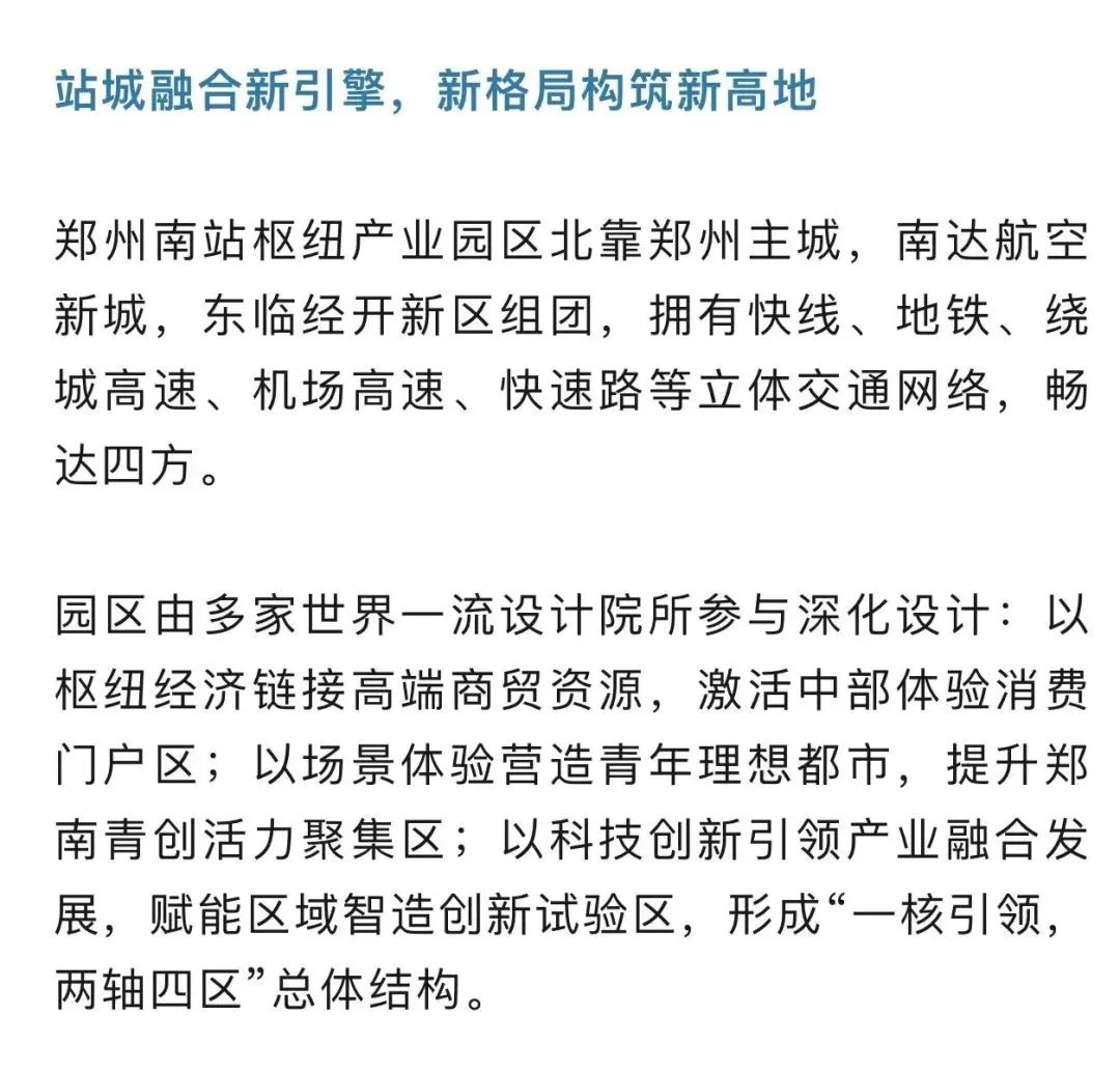 下一步,郑州南站及枢纽产业园区将围绕“一心两轴、多带互联”总体格局,贯彻“世界眼光、国际标准、国内一流”建设理念,响应社会期盼、服务群众高品质出行,将郑州南站建设成为城市建设新标杆、产业发展新高地、站城融合新典范。