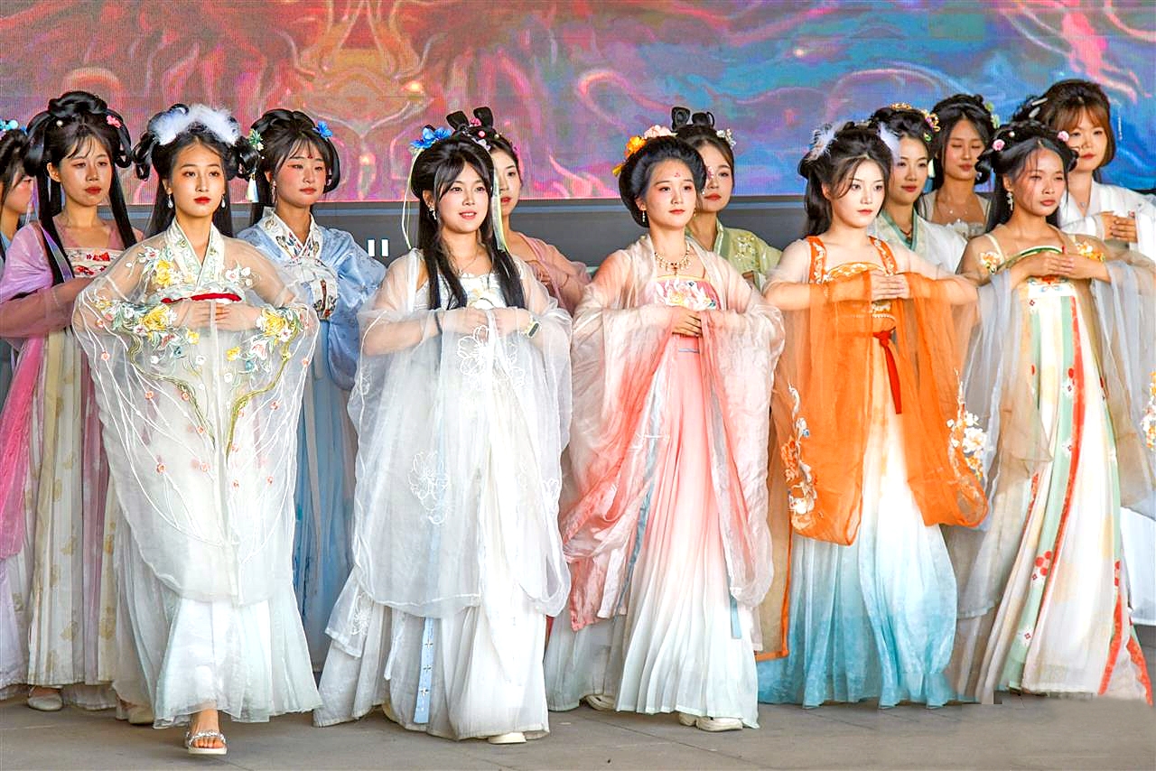 5月21日,湖北荆州,长江大学文理学院建筑与设计学院“泮池五月文化节·楚风雅集”活动现场,一群大学生身着战国袍自信走秀,引来现场观众鼓掌点赞。
