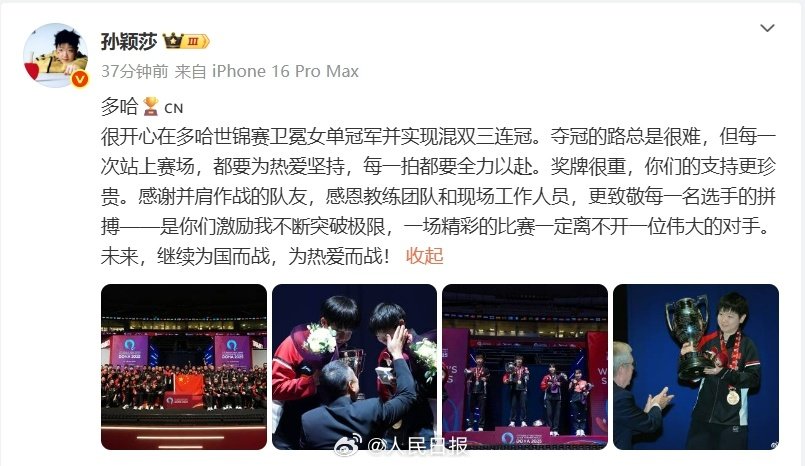很开心在多哈世锦赛卫冕女单冠军并实现混双三连冠。夺冠的路总是很难,但每一次站上赛场,都要为热爱坚持,每一拍都要全力以赴。奖牌很重,你们的支持更珍贵。感谢并肩作战的队友,感恩教练团队和现场工作人员,更致敬每一名选手的拼搏——是你们激励我不断突破极限,一场精彩的比赛一定离不开一位伟大的对手。