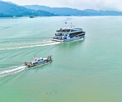 28日下午,纯电动力海上旅游客船“屿见77”(右)在福建省福安市赛江流域完成试航。该船预计于今年6月交付投入试运营。“屿见77”轮总长49米、宽14.5米,额定载客358人,最大航速20公里/小时,续航里程达45海里,兼具海上休闲娱乐、游览观光、会议和餐饮功能,是我国首艘入级中国船级社的纯电海上客船。
