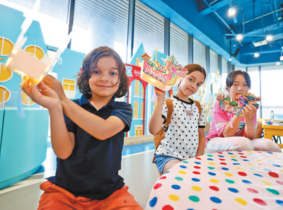 图为中外儿童展示他们制作的端午立体龙舟灯笼。 |