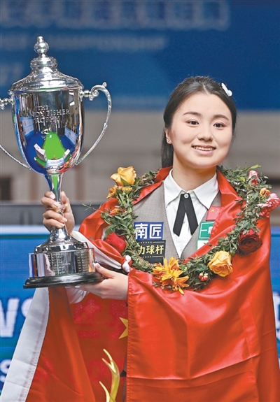 9场连胜、以单杆112分获得赛会单杆最高分……白雨露高捧奖杯,马尾轻扬,笑靥如花。这是她连续3年闯入女子世锦赛决赛,收获两冠一亚。