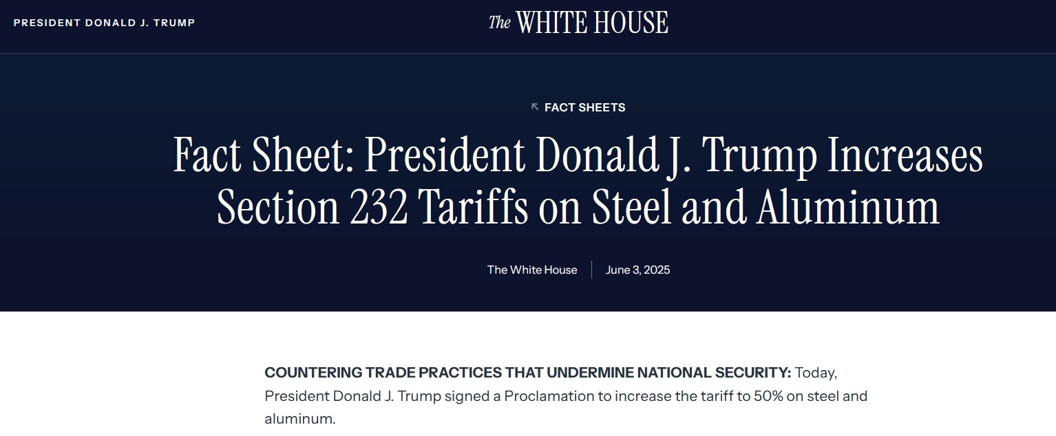 与此同时,美国政府继续挥舞“关税大棒”。当地时间6月3日,美国白宫发表声明称,美国总统特朗普宣布将进口钢铁和铝及其衍生制品的关税从25%提高至50%,该关税政策自美国东部时间2025年6月4日凌晨00时01分起生效。