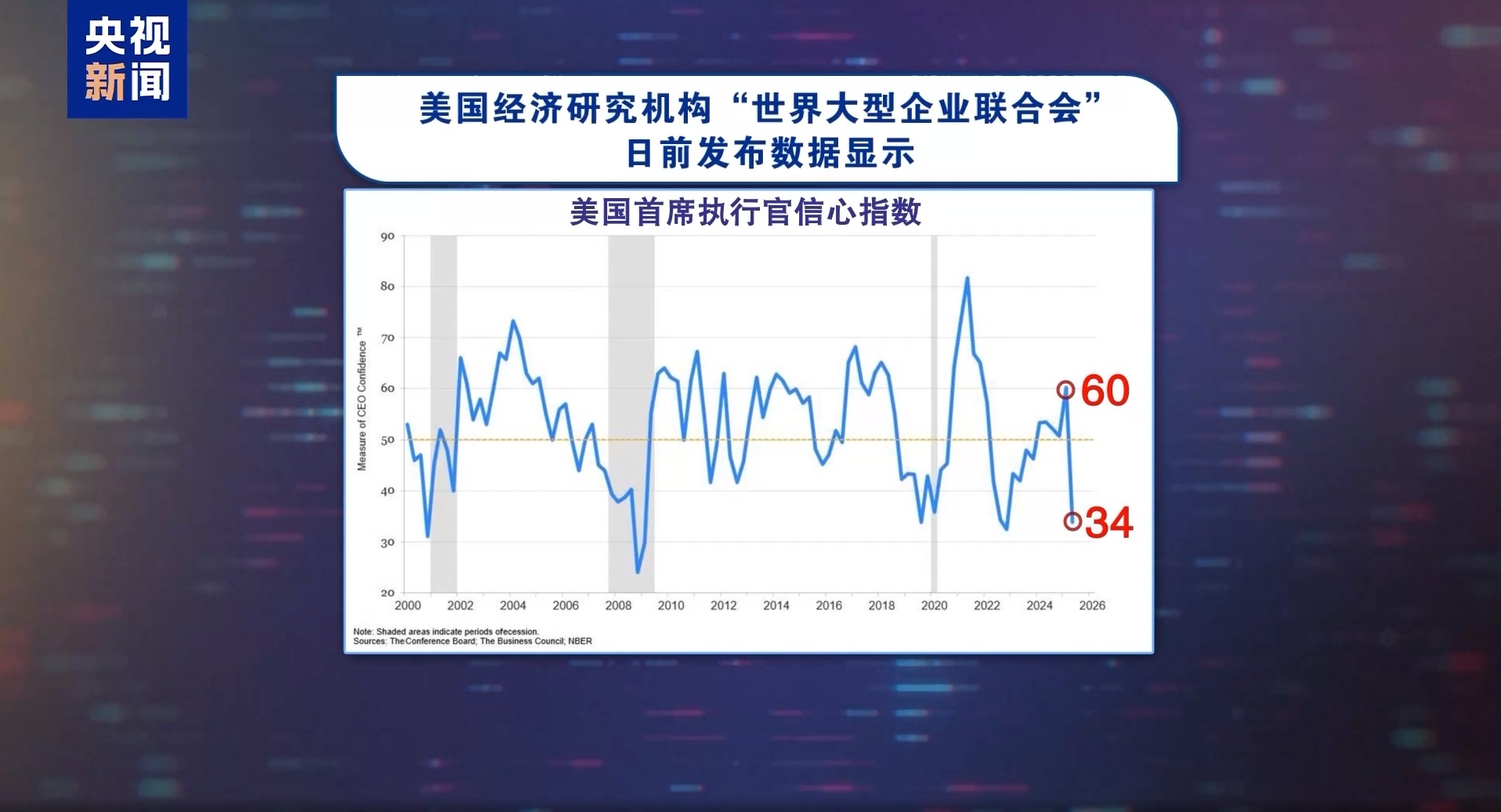 美国经济研究机构“世界大型企业联合会”日前发布数据显示,美国2025年第二季度首席执行官信心指数从此前的60点跌至34点,为2022年第四季度以来的最低水平,这也是该调查自1976年启动以来的最大环比降幅。