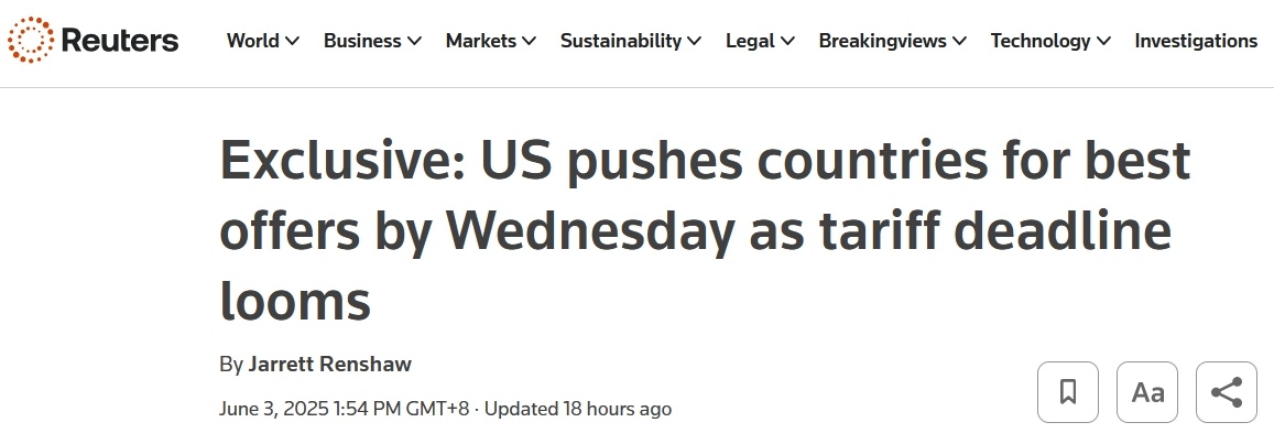 据路透社当地时间6月3日报道,距离对等关税恢复期限仅剩五周,特朗普政府发出紧急信函,要求各国在本月4日前提交贸易谈判的最佳方案。