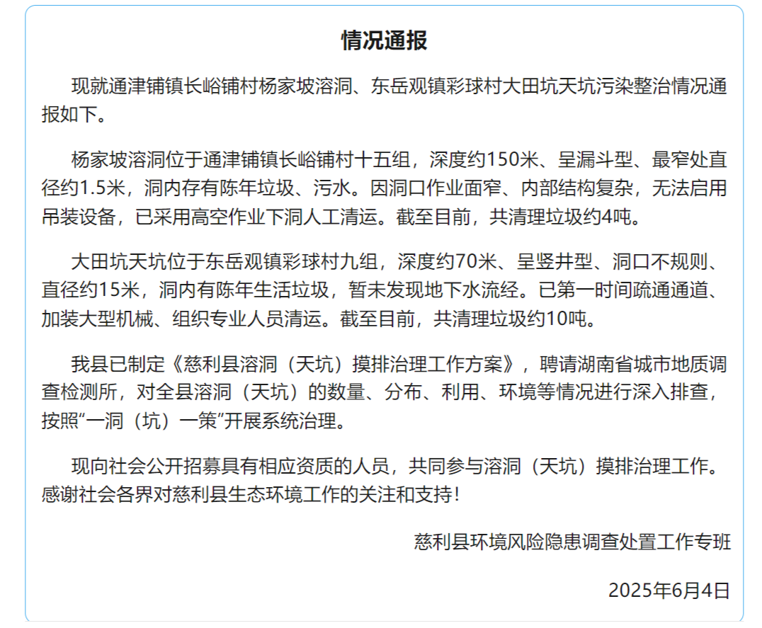 据“慈利发布”微信公众号消息,6月4日,湖南慈利县环境风险隐患调查处置工作专班就通津铺镇长峪铺村杨家坡溶洞、东岳观镇彩球村大田坑天坑污染整治情况发布通报,具体如下: