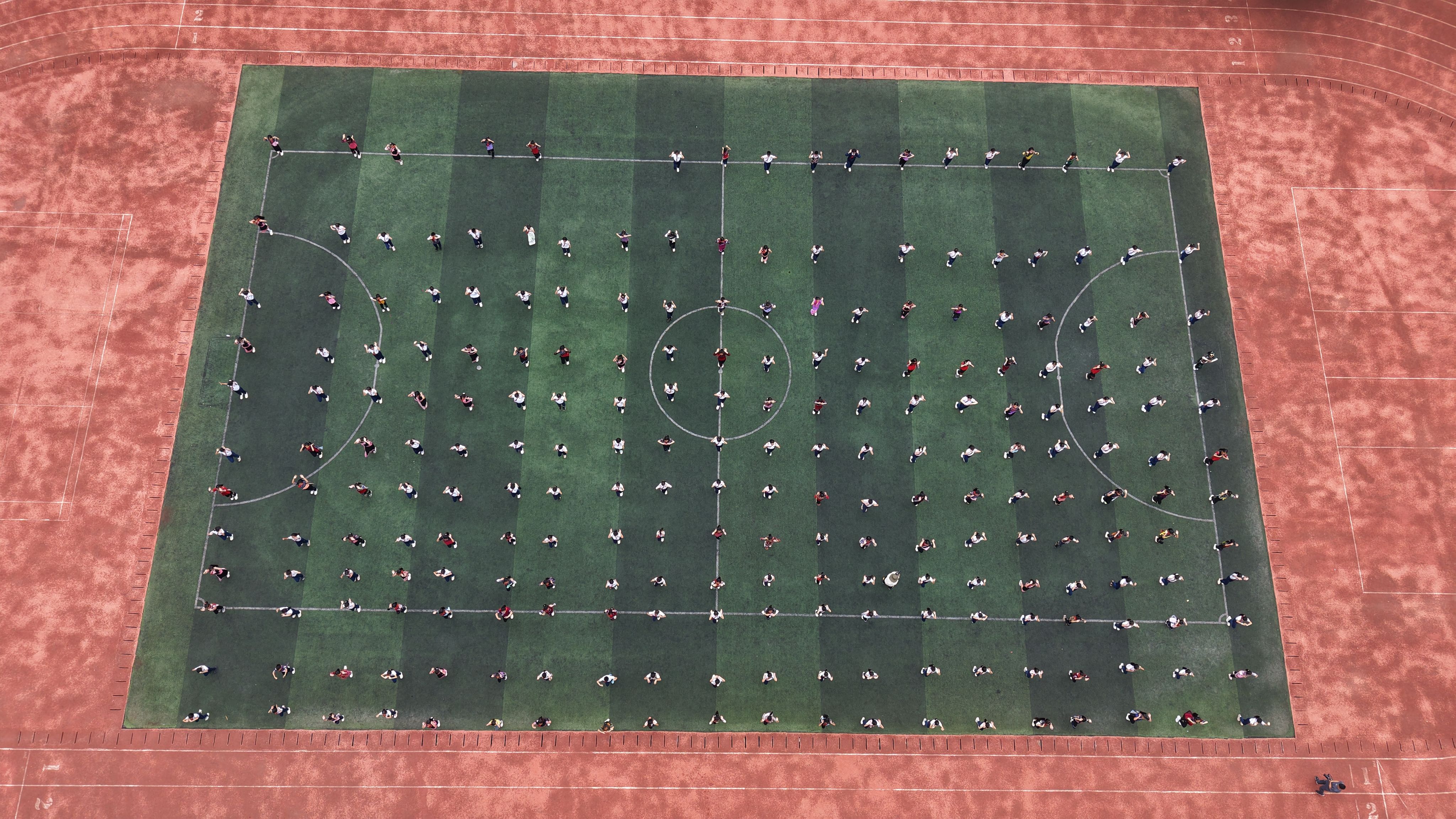 课间操时间一到,南沙中心小学的操场上,学生们身着民族盛装,迅速集合成方阵。无人机俯瞰,操场宛如民族文化舞台,学生们随着欢快的民族音乐,整齐划一地跳着融合民族舞元素的课间操,动作充满力量与美感,民族舞蹈韵味十足。