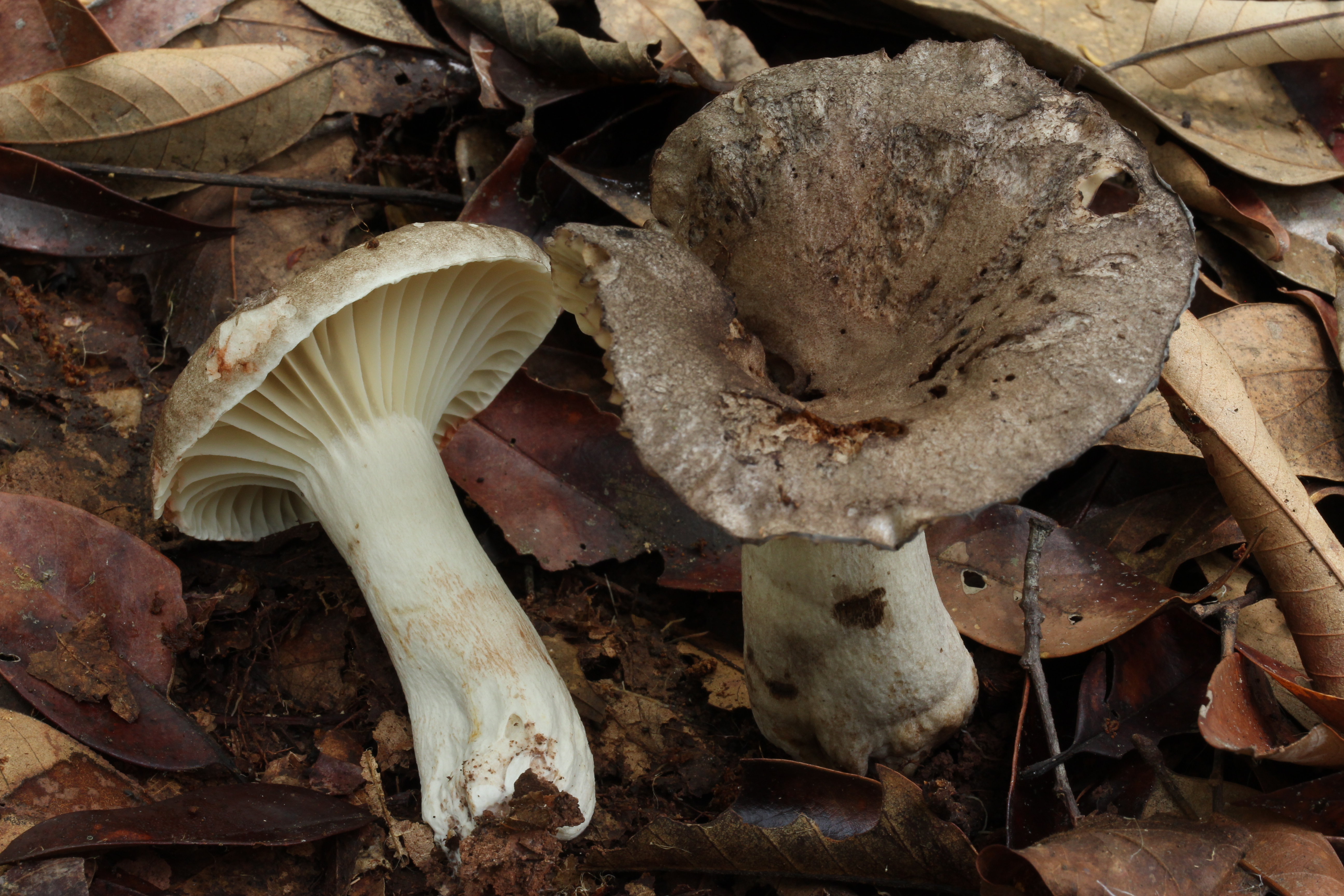 辨识特征:亚稀褶红菇的菌体中等大小。菌盖表面呈灰白色、浅灰色至煤灰黑色,成熟后常向上反卷,边缘无条棱。菌肉呈白色,受伤后易变红色而不再变黑色。