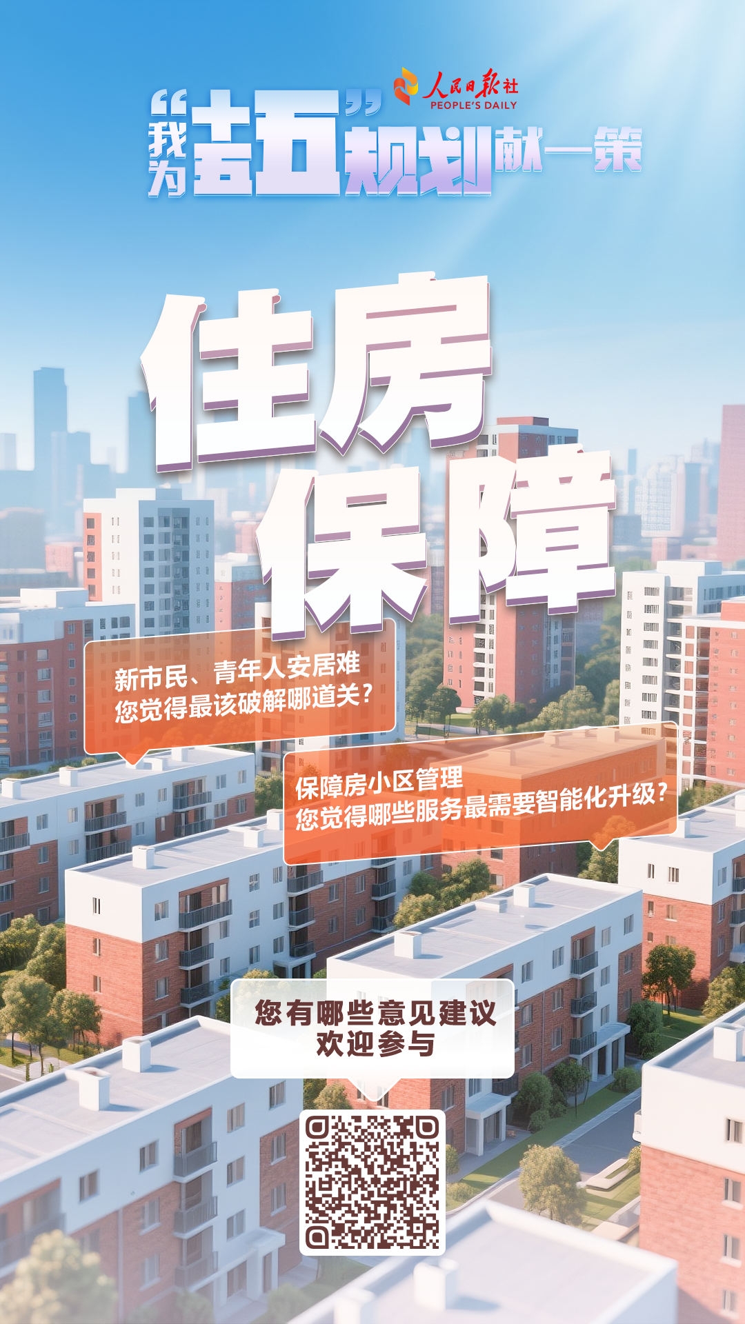 为贯彻落实习近平总书记重要指示精神,“十五五”规划编制工作网络征求意见活动5月20日正式启动。新市民、青年人安居难,您觉得最该破解哪道关?保障房小区管理,您觉得哪些服务最需要智能化升级?围绕“住房保障”话题,您还有哪些意见建议?欢迎点击海报或扫二维码进入“我为‘十五五’规划献一策”征集页面,贡献智慧!