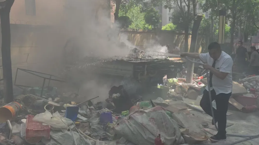 “不好,起火了,快来灭火!”6月3日13时许,在大兴区首创悦都会小区的垃圾分类处,一辆货车突然起火,随着一声大喊,社区巡逻的微型消防站人员奔向着火地点,使用灭火器先行处置。