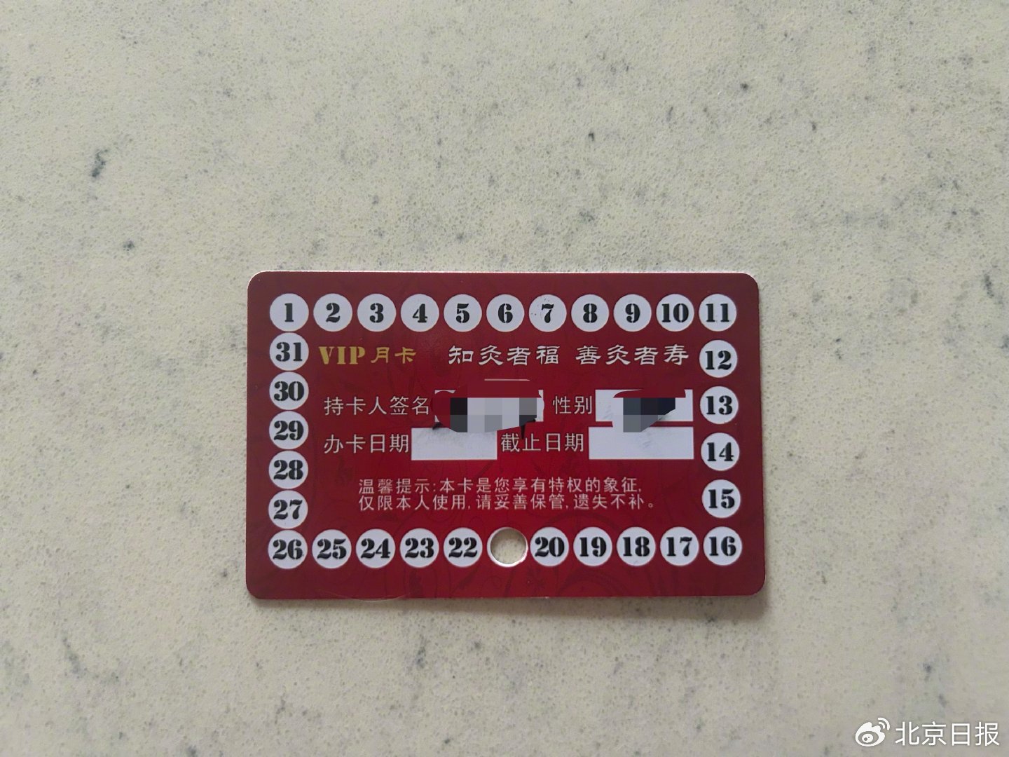 市民李阿姨向记者讲述了她在“田蜜XX”艾灸馆的第一次体验。“工作人员就是问了问我多大、退休没、家住哪,就给了我一张VIP月卡。”李阿姨出示的月卡上,印着1至31的数字圆点,其中“21”的数字上有个孔。“那天是21号,他们就在那打了个孔,说是每来一次就能打一次卡,然后得份小礼品,如果能连续来31天,还能获得特别奖励。”