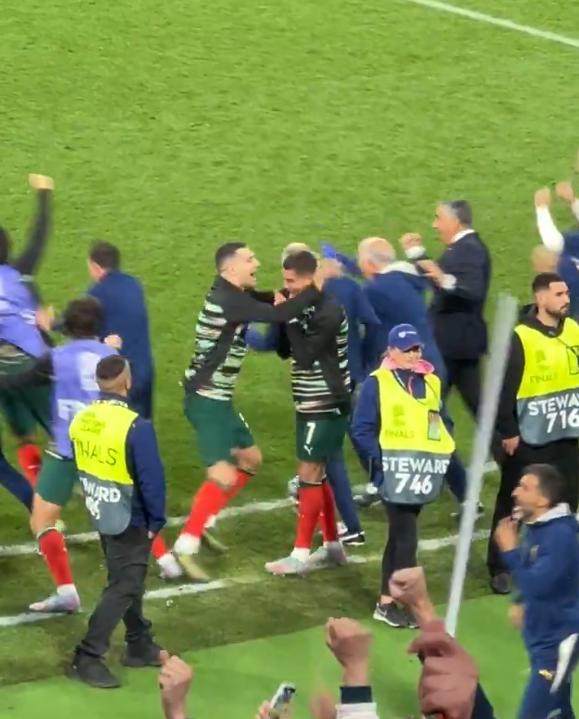 一般而言,点球大战,先主罚的一队赢面更大。第88分钟受伤下场,C罗把队长袖标给了布鲁诺·费尔南德斯。B费手气还不错,点球大战掷硬币,他猜赢了正反面,葡萄牙队得以率先主罚。另一个对葡萄牙队有利的因素,是点球大战所用的球门,其后面看台上坐的是葡萄牙队拥趸。C罗走到球门处,跟队友们一起庆祝起来。转播镜头捕捉到B费把队长袖标还给了C罗,他把它佩戴到自己左臂上。作为葡萄牙队队长,他将第3次举起冠军奖杯。
