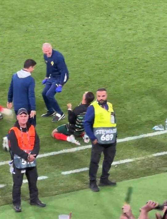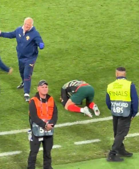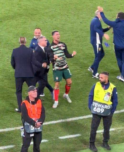 达洛特跑去跟其他队友庆祝,C罗却双手握拳,身体后仰,依旧跪在地上。有人去安慰他,他也不动。他之后低下头,把脸埋在草皮里。最后,他终于站了起来,双手握拳,高喊着庆祝。跟一位教练组成员抱在一起,他已经热泪盈眶。在现场看球的前辈巨星菲戈也下到场上,跟C罗拥抱并祝贺他。