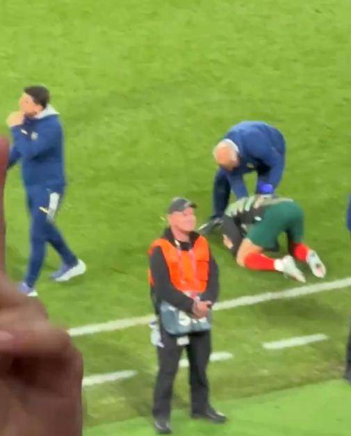 毕竟是40岁的人了,第88分钟,C罗突破后倒在地上。他受伤了,也跑不动了。下场之后,坐在替补席上,他一度双手合十祈祷。点球大战时,站在场边,他双手捂着双眼不敢看。随后,他又把自己的脸埋在队友达洛特的肩背部。鲁本·内维斯为葡萄牙队打进第5个点球,C罗没看到。达洛特先是跳起来欢呼,然后又转过身来,跟C罗拥抱到一起。C罗整个人似乎都瘫软了,他跪到了地上。达洛特手放在C罗的颈部,使劲摇晃他,然后还亲吻了他的额头。