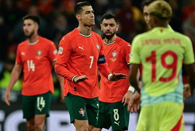 从球门里抱起皮球往中圈跑时,C罗向西班牙球员竖起了右手食指。西班牙队中圈开球之后,C罗还沉浸在进球的激动中。他咬着牙,目光坚毅地朝着亚马尔看去。C 罗似乎是在说:“我40岁了,但我依旧牛逼。”
