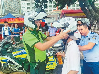 海南省三亚市交警为走错考场的考生佩戴头盔,并将其送往考场。 |