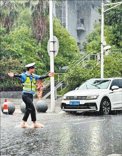 湖南省益阳市公安局交警支队桃花仑中队辅警在雨中疏导交通,指挥车辆有序通行。 |