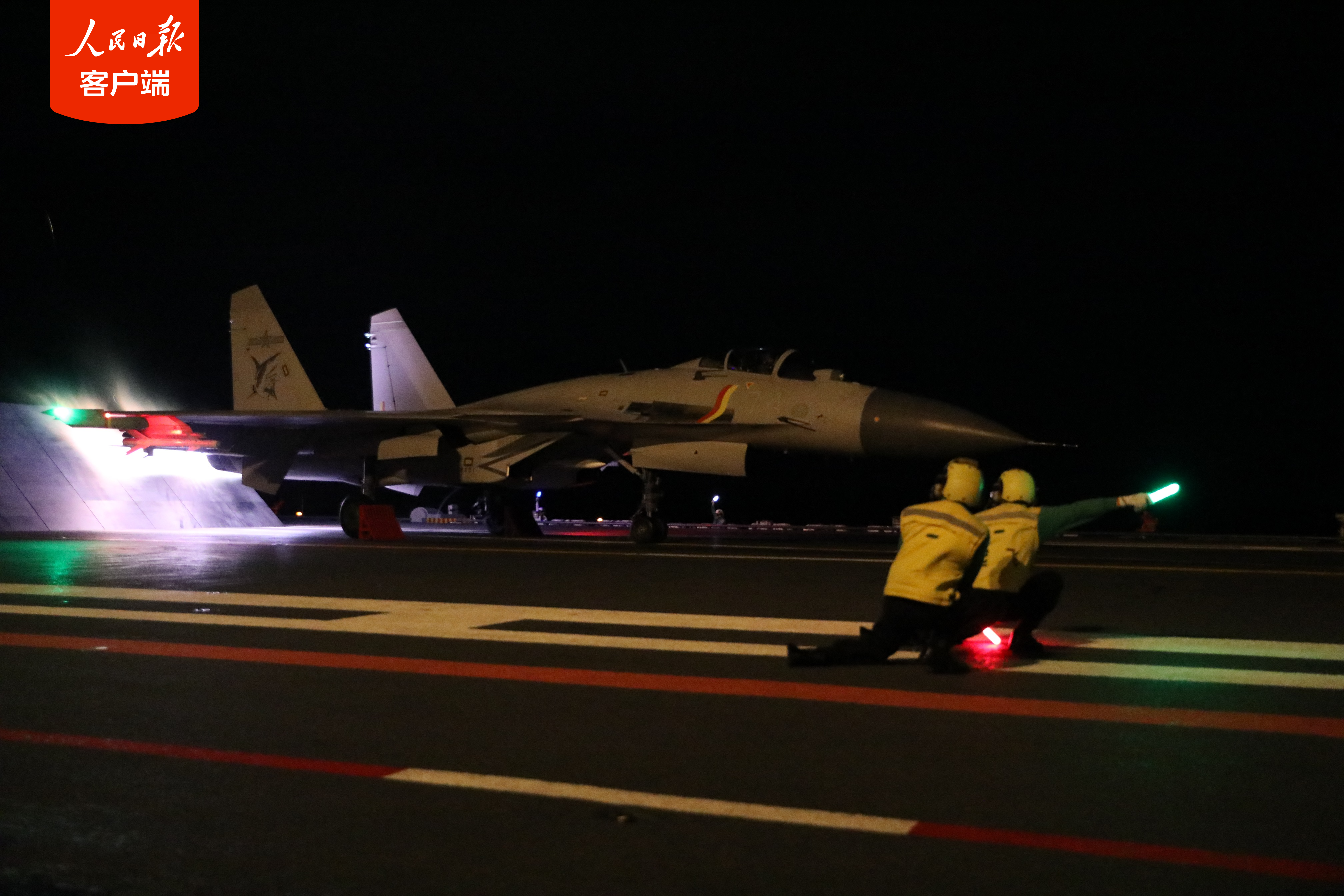 6月上旬,海军航母编队在西太平洋海域开展训练,图为舰载战斗机进行夜间起飞。 王 健 摄
