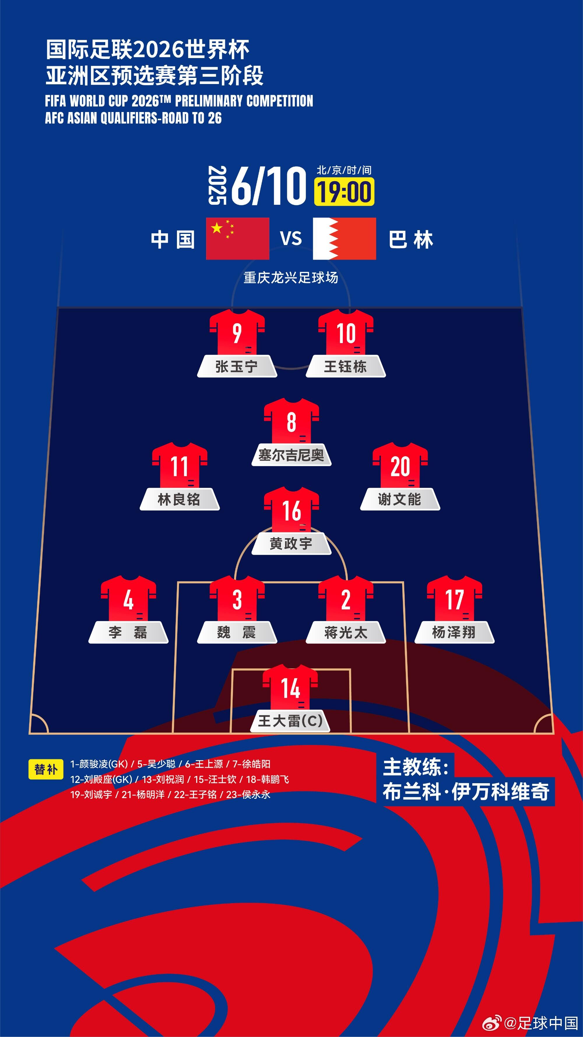 北京时间6月10日晚,中国队将在重庆龙兴足球场迎战2026年美加墨世界杯亚洲区预选赛第三阶段的最后一个对手巴林队。刚刚,中国队公布了本场比赛的首发名单,上一轮停赛的林良铭和谢文能回归首发,身披10号球衣的王钰栋则和张玉宁搭档锋线。