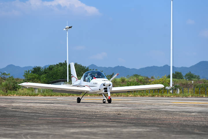 2025年5月,重庆两江新区龙兴通用机场。一架轻型运动类飞机从跑道上轻盈腾起,升入湛蓝天空,开启空中观光之旅。座舱内,乘客们俯瞰大地,将山城独特的山水风貌尽收眼底。