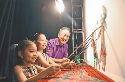 侯建川与孩子们共同表演孝义皮影戏。 |