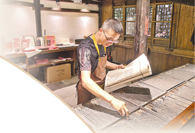 排版完毕,先给印版刷上清水,再将墨汁均匀涂抹在印版上,铺上宣纸用刷子来回印刷。揭开后,一张墨迹清晰的竖写宋体书页便跃然眼前了。