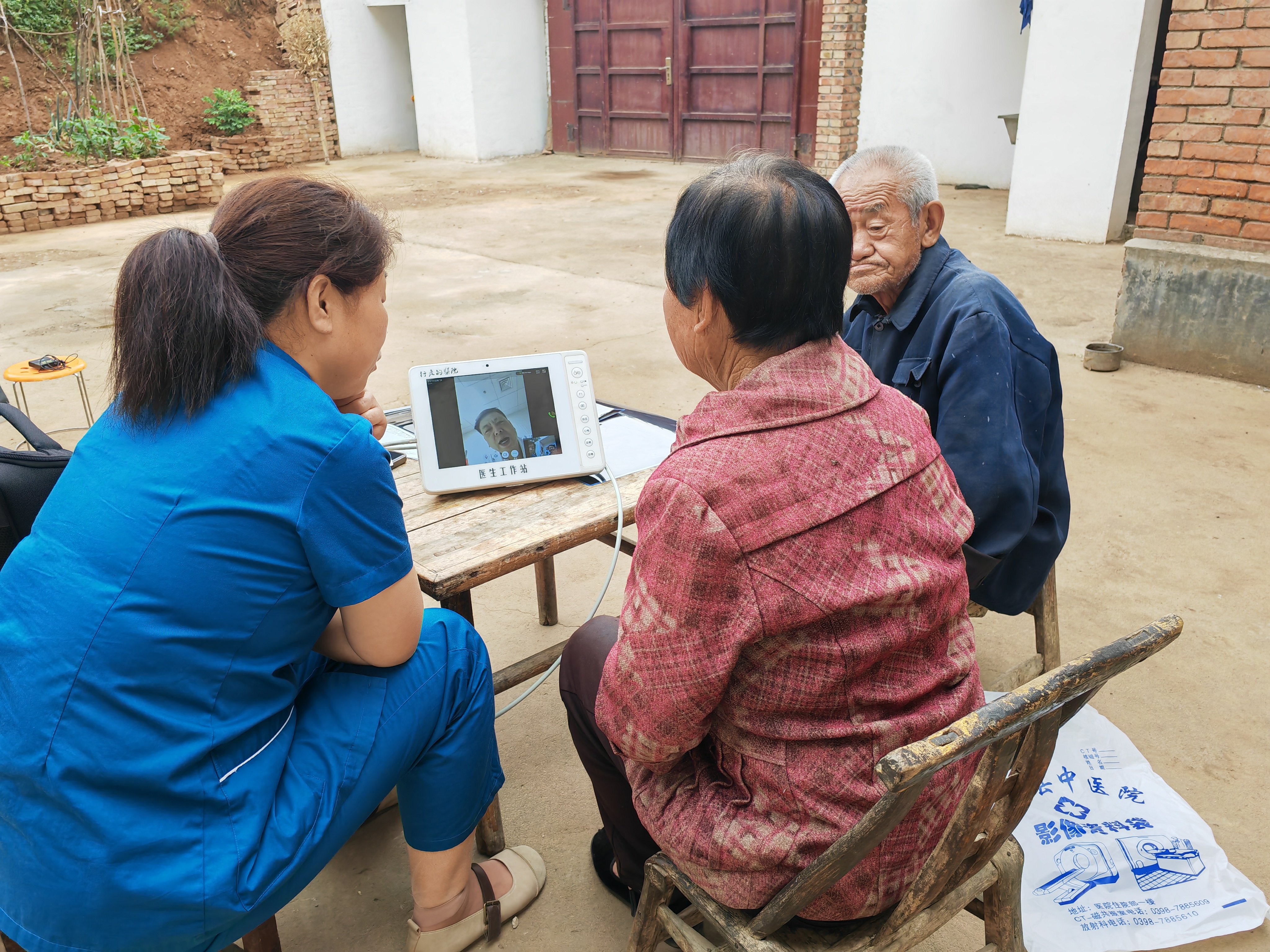 卢氏县东明镇当家村村医刘海红到村民家里巡诊,通过“行走的医院”医生工作站连线县人民医院专家问诊。张海军摄