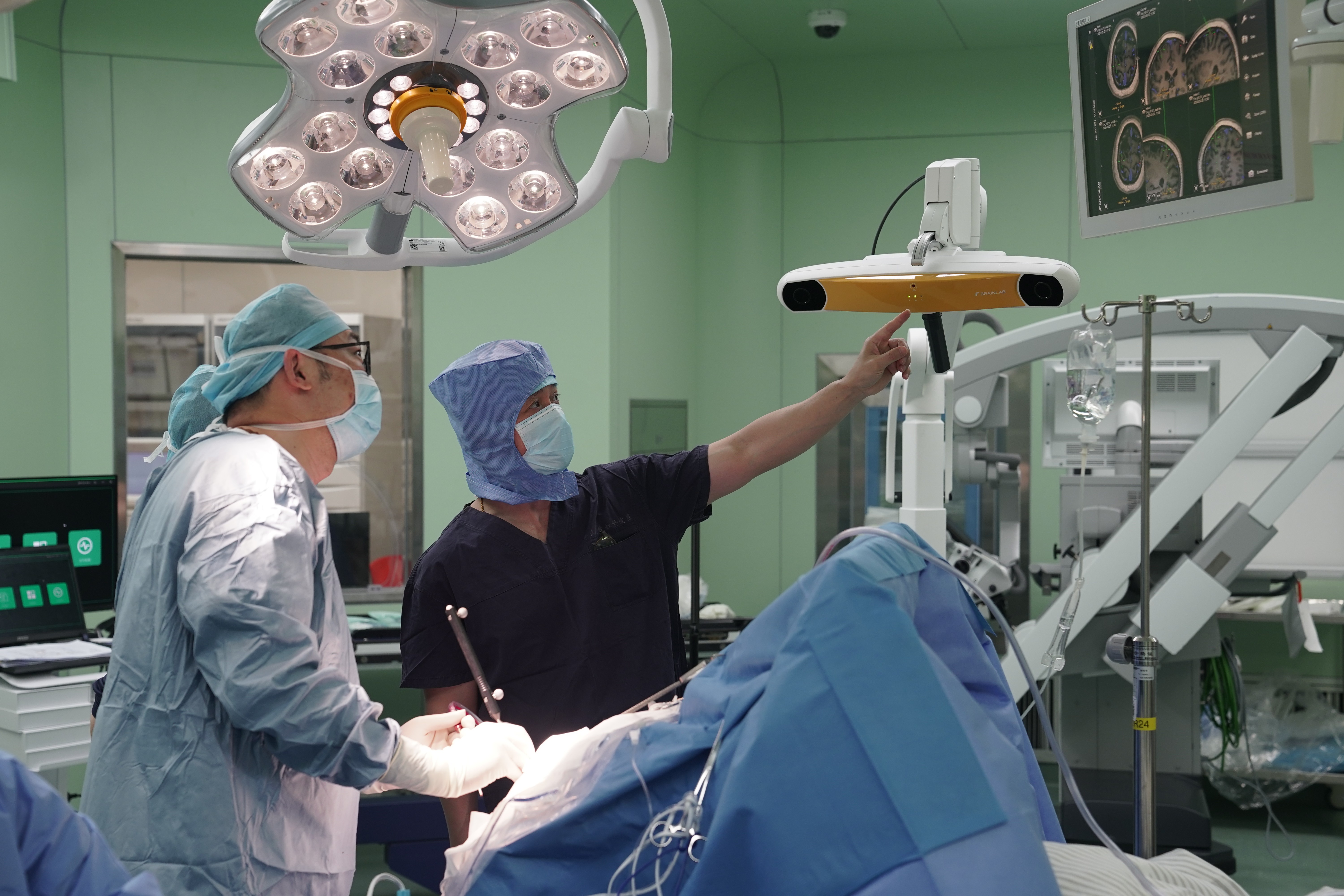我国首例侵入式脑机接口前瞻性临床试验手术现场,吴劲松教授与路俊锋教授做讨论