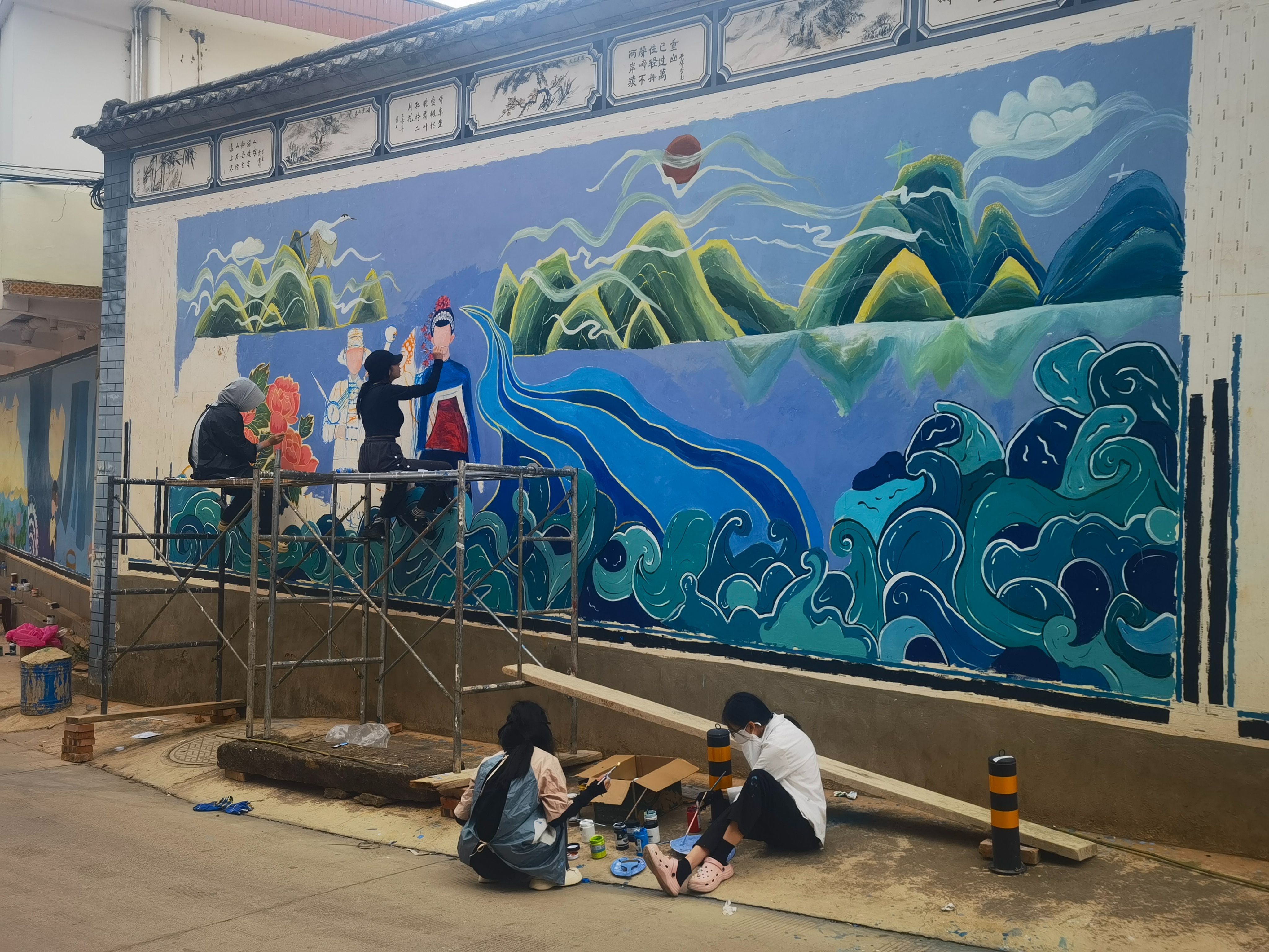 除了树立村名标识碑,龚栋强还组织云南艺术学院设计学院的40名师生在村子里发起“设计新生活,彩绘自由村”行动,创作了以民族团结、绿水青山等为主题的14幅墙绘,并题写十余幅融合了南诏文化的楹联,用艺术创作扮靓村庄。