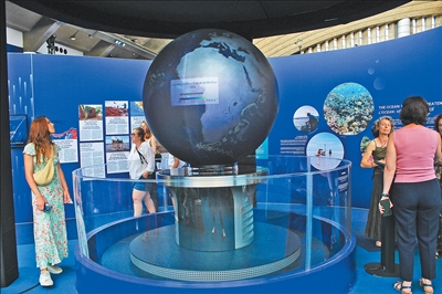 第三届联合国海洋大会期间,在尼斯会展宫设立的“鲸鱼馆”公众展区,一座互动球体装置以可视化方式还原了全球洋流动态,吸引参观者驻足。 |