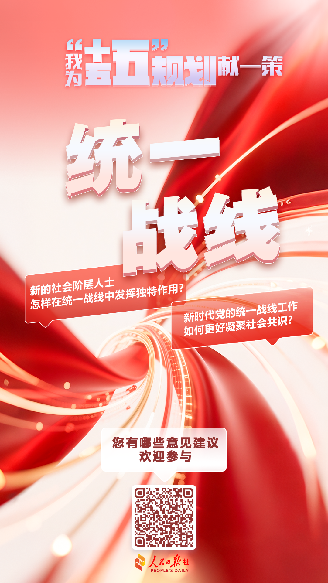 为贯彻落实习近平总书记重要指示精神,“十五五”规划编制工作网络征求意见活动5月20日正式启动。新的社会阶层人士怎样在统一战线中发挥独特作用?新时代党的统一战线工作如何更好凝聚社会共识?围绕“统一战线”话题,您还有哪些意见建议?欢迎点击海报或扫二维码进入“我为‘十五五’规划献一策”征集页面,贡献智慧!