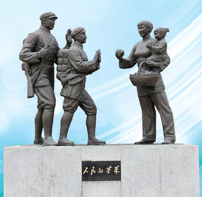 “您瞧,这位老人抱着孩子、提着篮子,想把苹果塞给两位战士,却被他们摆手谢绝——这座‘人民的苹果’雕塑,正是根据辽沈战役期间那段真实往事创作的。”