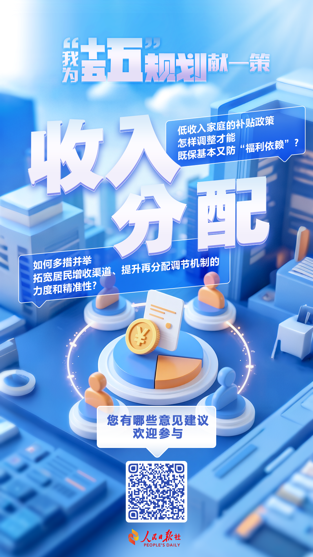 为贯彻落实习近平总书记重要指示精神,“十五五”规划编制工作网络征求意见活动5月20日正式启动。低收入家庭的补贴政策怎样调整才能既保基本又防“福利依赖”?如何多措并举拓宽居民增收渠道、提升再分配调节机制的力度和精准性?围绕“收入分配”话题,您还有哪些意见建议?欢迎点击海报或扫二维码进入“我为‘十五五’规划献一策”征集页面,贡献智慧!