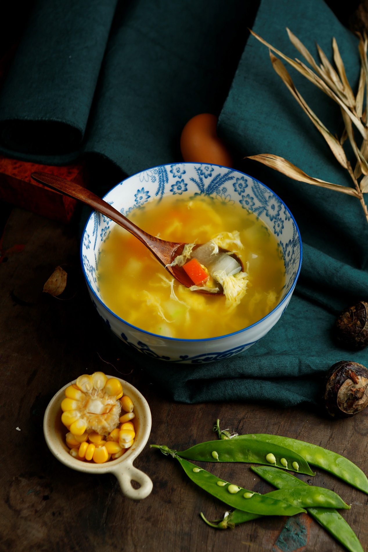 材料:鲜玉米2根,豌豆100g,红萝卜半条,马蹄10个,冬瓜100g、鸡蛋一个