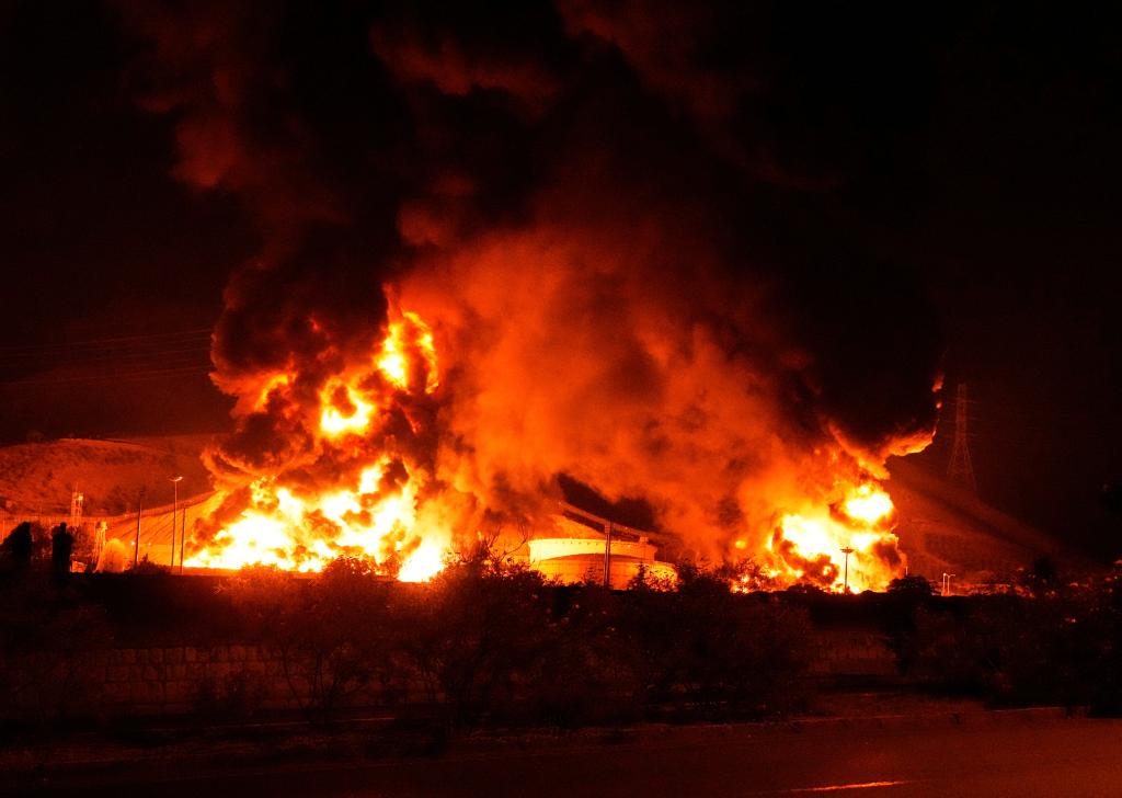 这是6月15日凌晨拍摄的伊朗首都德黑兰附近遭以色列袭击起火的储油设施。新华社发