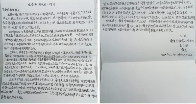 吉林外国语大学秦和校长获悉此事后,立即召开专题会议,要求深入彭小桐家里,制定精准帮扶措施,并给她写了一封饱含深情的信。