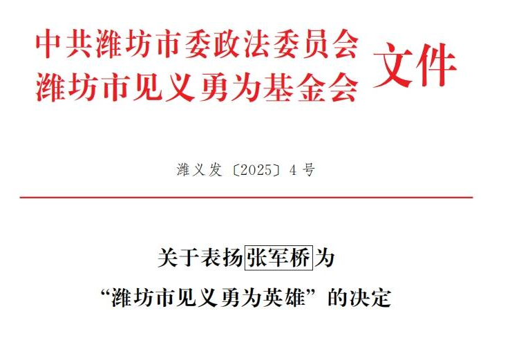 6月23日,中共潍坊市委政法委员会、潍坊市见义勇为基金会发布“关于表扬张军桥为‘潍坊市见义勇为英雄’的决定”。
