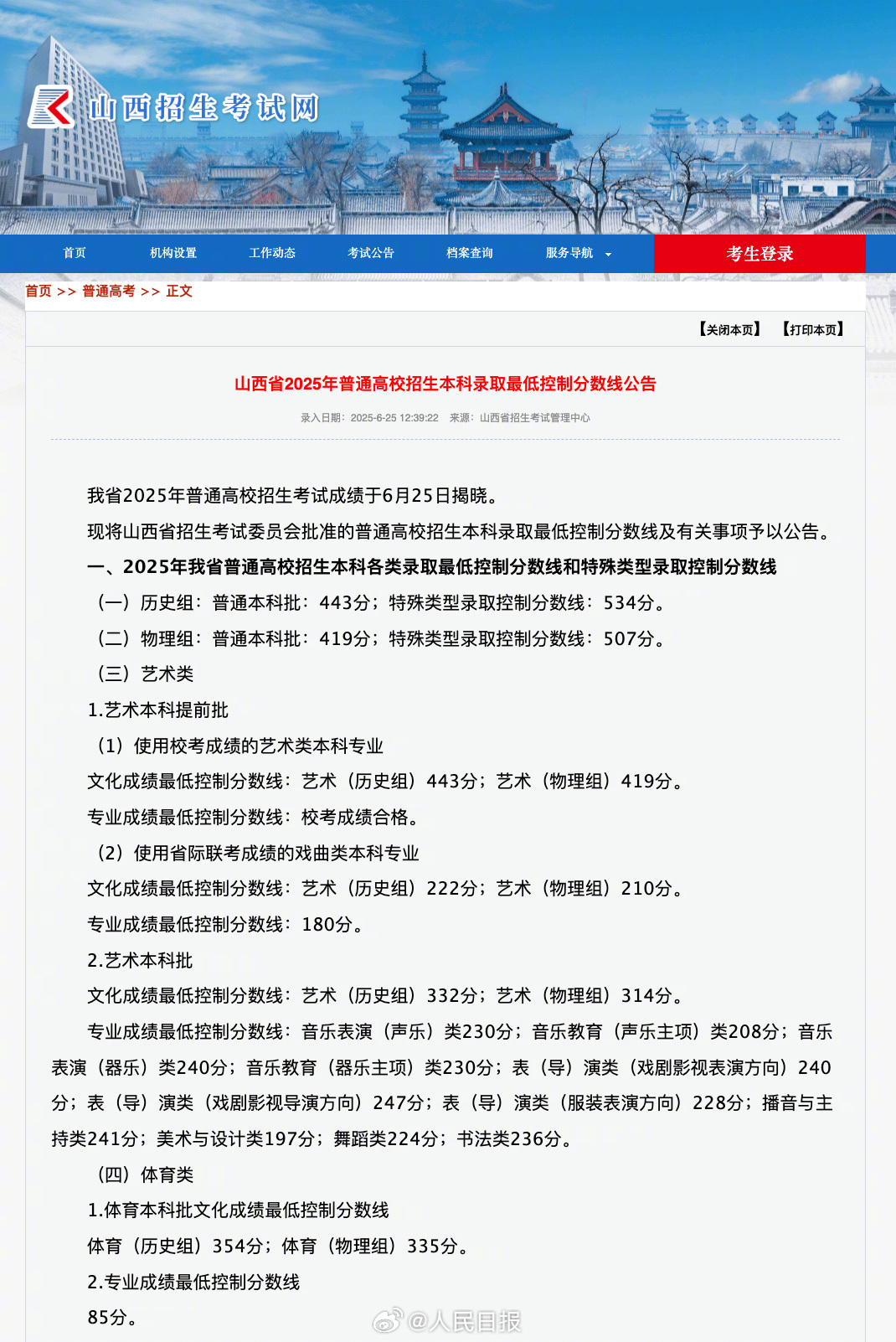 山西省2025年普通高校招生本科录取最低控制分数线: