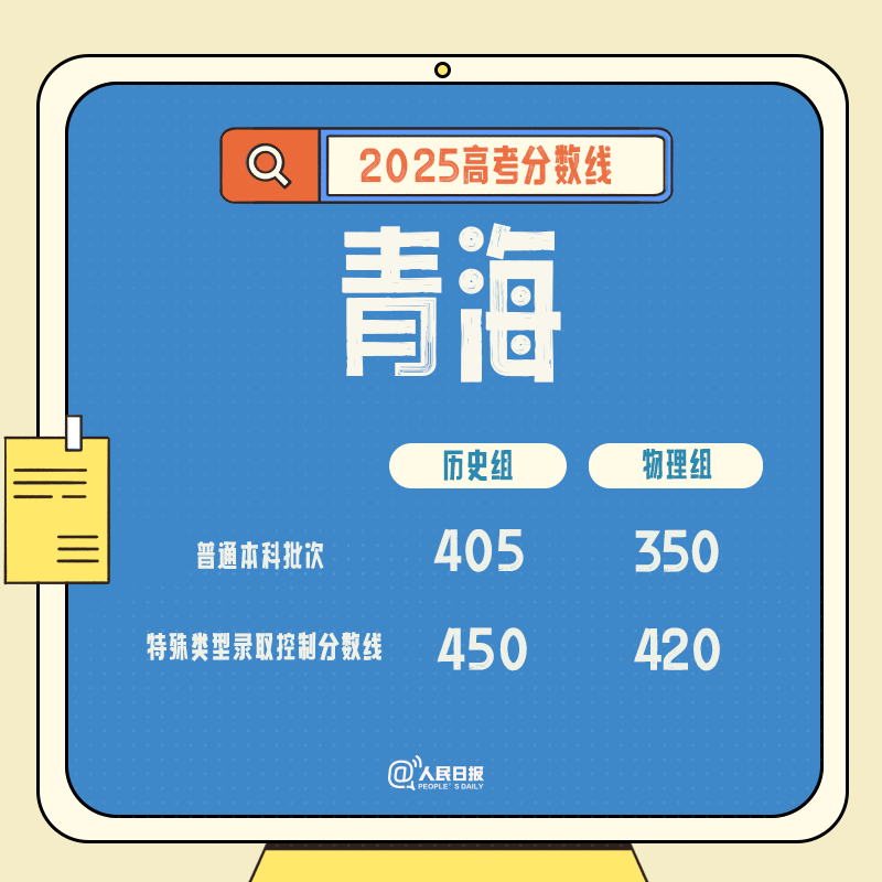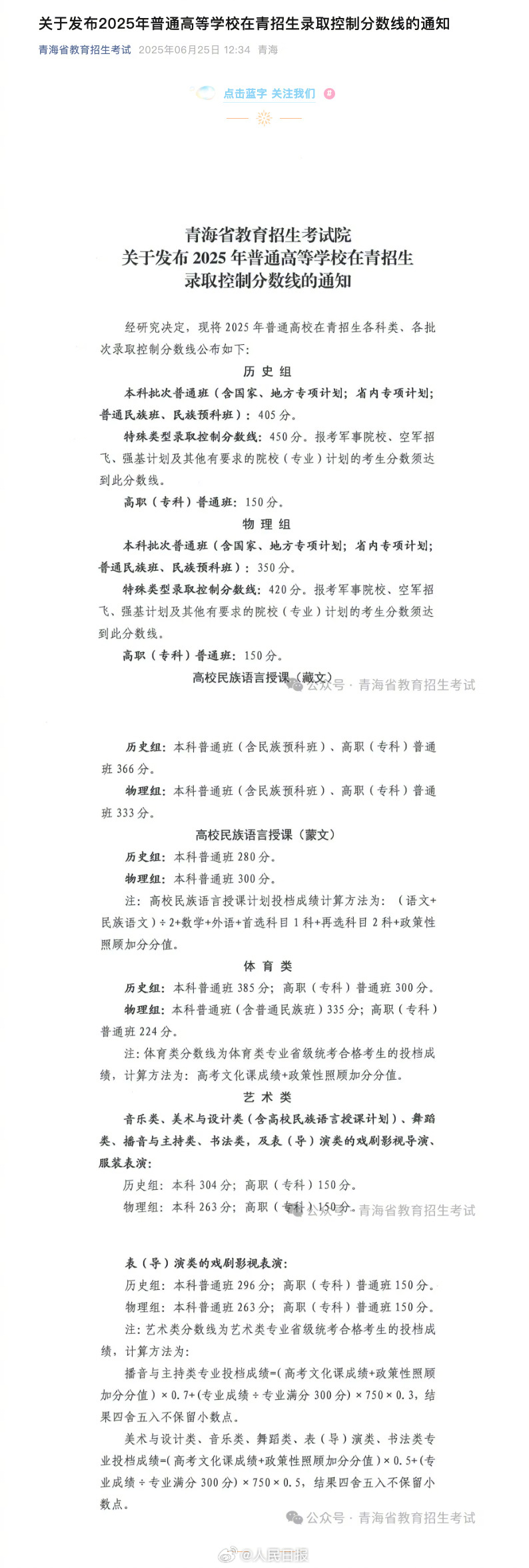 青海省发布2025年普通高等学校在青招生录取控制分数线: