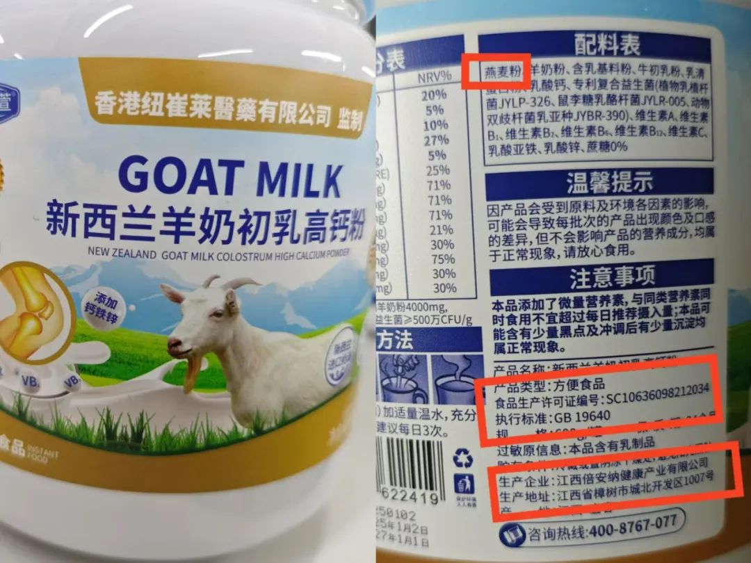 某品牌“新西兰羊奶初乳高钙粉”产品类型为方便食品,主要原料是燕麦粉。图源新京报