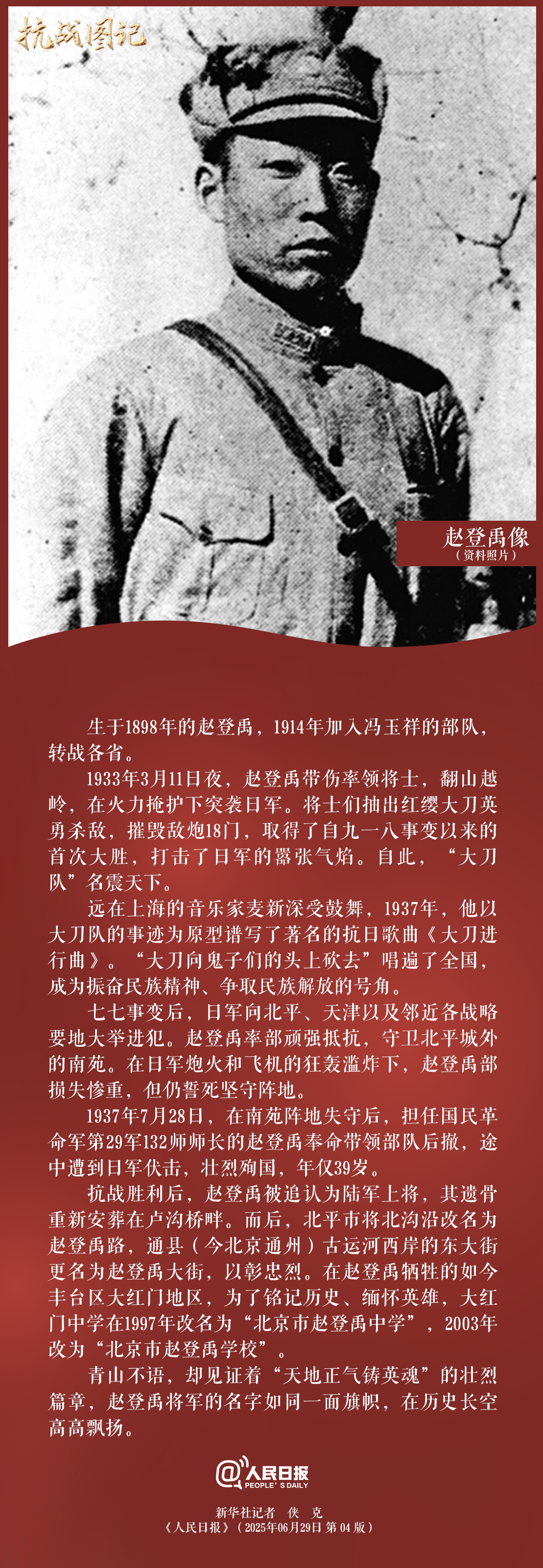 生于1898年的赵登禹,1914年加入冯玉祥的部队,转战各省。1933年3月11日夜,赵登禹带伤率领将士,翻山越岭,在火力掩护下突袭日军。将士们抽出红缨大刀英勇杀敌,摧毁敌炮18门,取得了自九一八事变以来的首次大胜,打击了日军的嚣张气焰。自此,“大刀队”名震天下。